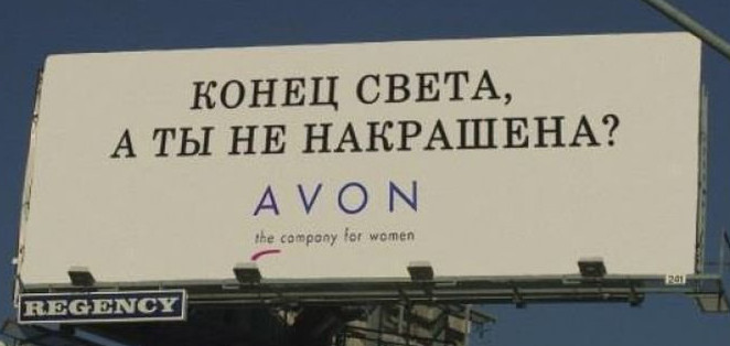 Task: You are the new marketing manager for Avon and have seen profits rising steadily in Russia due to the billboard campaign seen below. You would like to produce a similar campaign in Jamaica. Part of the preparation process is to modify the billboard so that it is understandable to the Jamaican population. Below you will modify the billboard's captions so that it can be used in Jamaica.